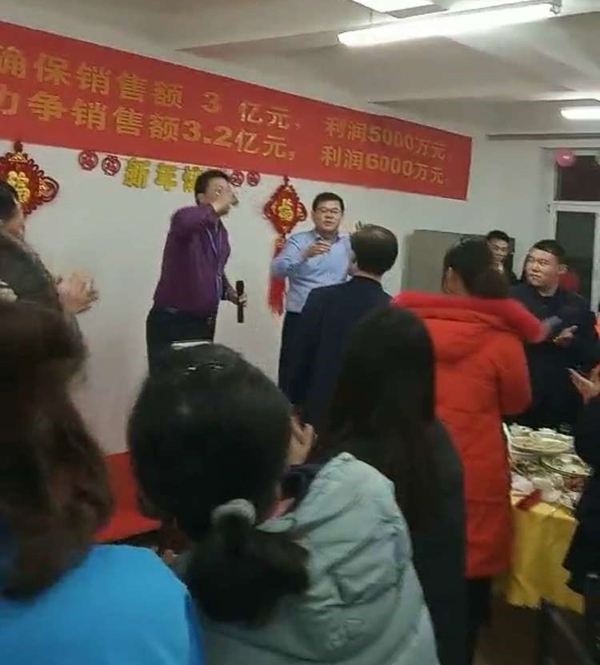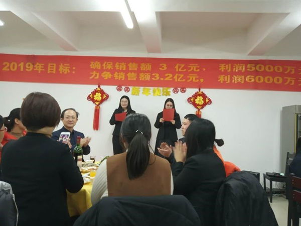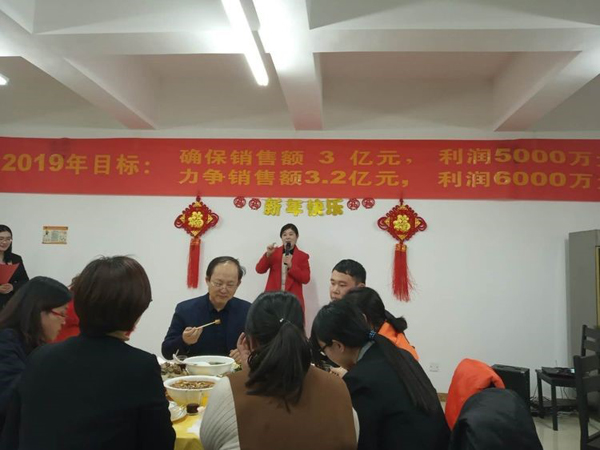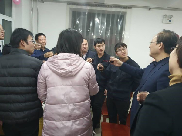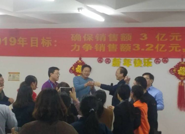 銷售部王云濤總,傾情提了四杯酒,敬董事長,敬自己,敬幕后人員。郝總代表大家為王總斟了一杯大酒,希望他2019年業(yè)績所向披靡,拿下5000萬目標。他中招干了半杯,銷售酒量一般都是兩斤啊,神勇。后勤部王震山總勇猛做陪,一起炸了半杯。