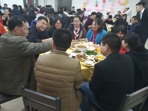 銷售內(nèi)務(wù)部李蒙蒙介紹自己的燒茄子,小編疏忽,只留下一張主廚的精彩發(fā)揮照 ◆ 相互敬酒 同事,職工朋友們相互敬酒,場面堪稱宏偉壯觀啊