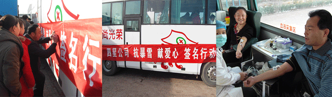于2010年11月,河北省遭遇60年罕見的暴風(fēng)雪,相關(guān)地區(qū)受災(zāi)嚴(yán)重,一方群眾急需血液,但血庫供血告急,當(dāng)公司接到上級(jí)政府救援通知后,及時(shí)動(dòng)員全體職工無償獻(xiàn)血,奉獻(xiàn)愛心活動(dòng)。