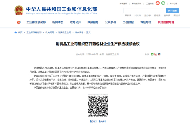 | 工信部消費品工業(yè)司組織召開藥包材企業(yè)生產(chǎn)供應(yīng)視頻會議 |